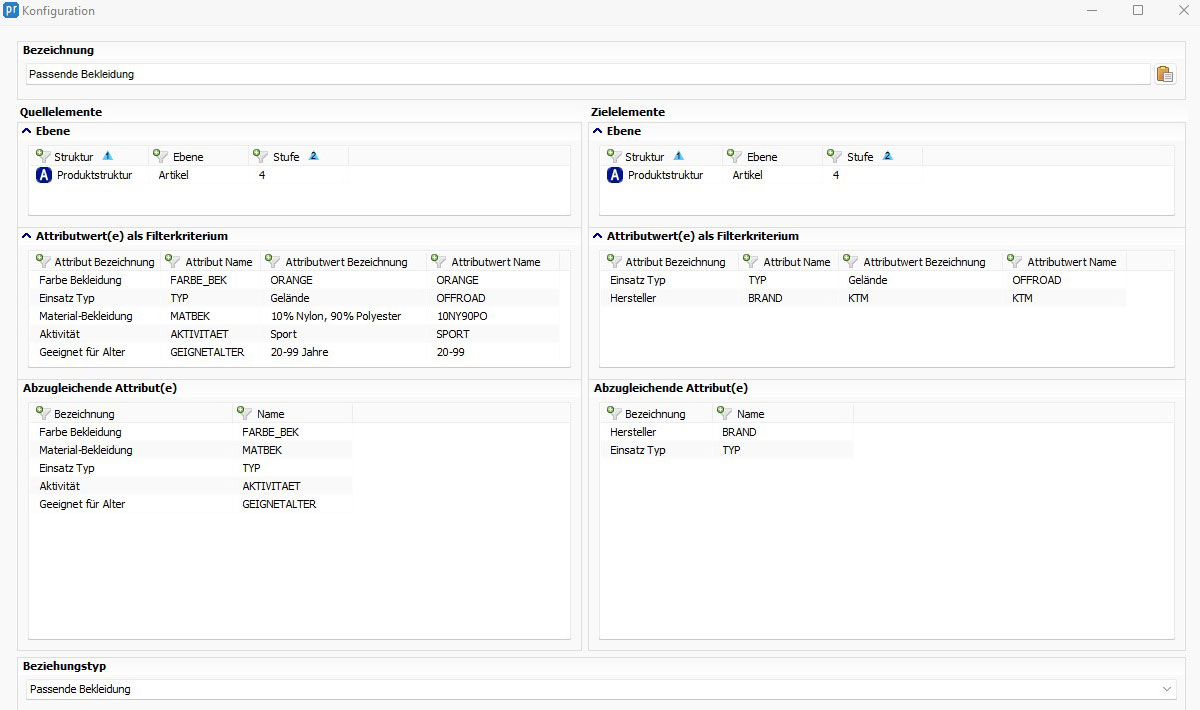 Beispiel 2 „passende Bekleidung“: Die Auswahl der passenden Bekleidung für ein Motorrad hängt von verschiedenen Kriterien ab. Dazu zählen Eigenschaften wie Farbe, Material oder Einsatztyp der Bekleidung. Diese werden am Quellelement (Bekleidung) festgelegt. Eine automatische Referenzierung erfolgt nur, wenn am Zielelement (Motorrad) die entsprechenden Merkmale wie Hersteller und Einsatztyp des Motorrads gepflegt sind. Durch diese Bedingung werden alle orangefarbenen Jacken, die aus Materialien für den Geländeeinsatz bestehen, automatisch an alle Motorräder referenziert, die vom Hersteller X sind und für den Geländeeinsatz ausgelegt sind.